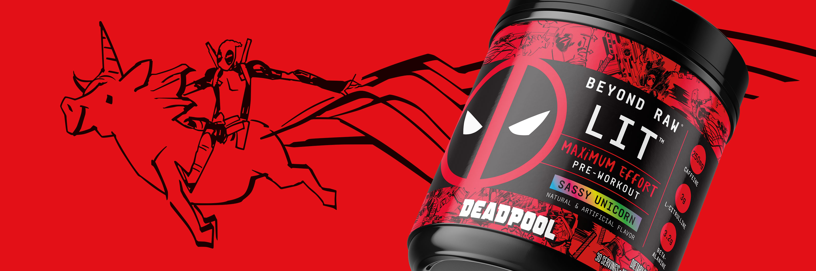 Objective: Create a co–branded BEYOND RAW LIT & DEADPOOL pre-workout packaging design.