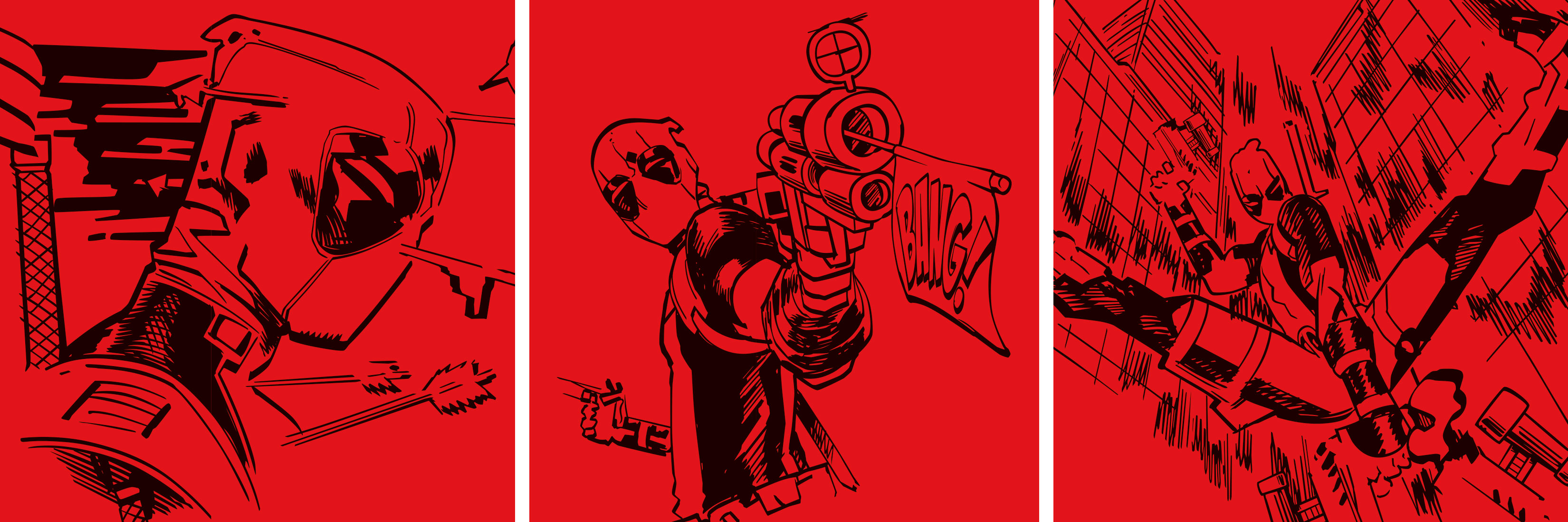 red and black, and comic-inspired graphic textures. The result is an unapologetically loud,